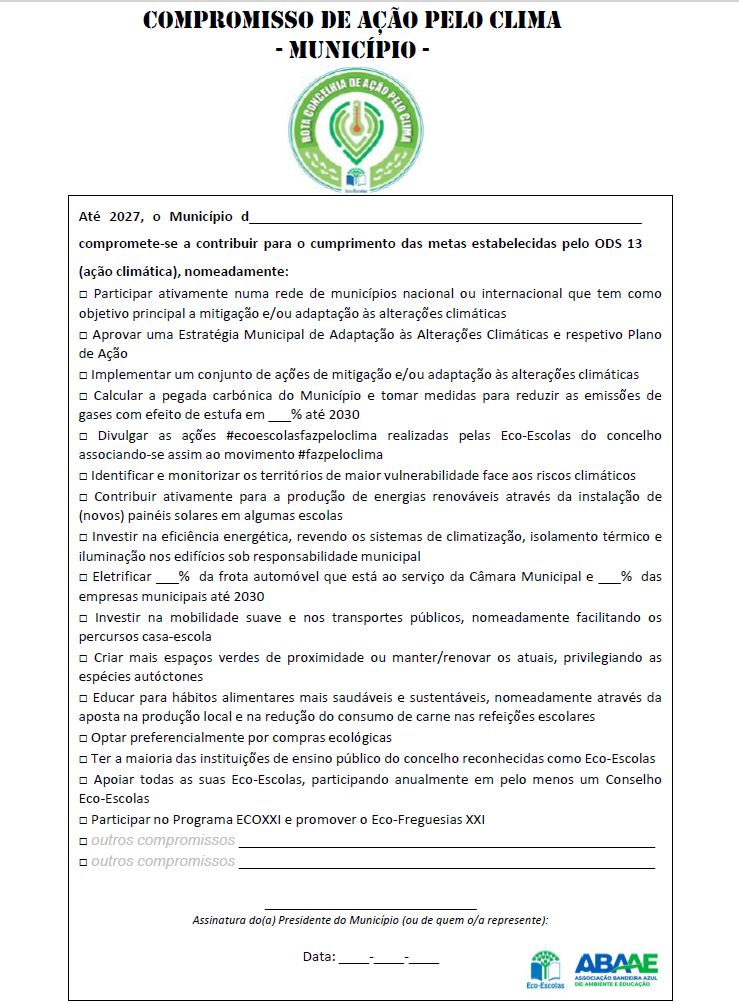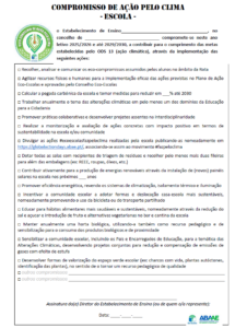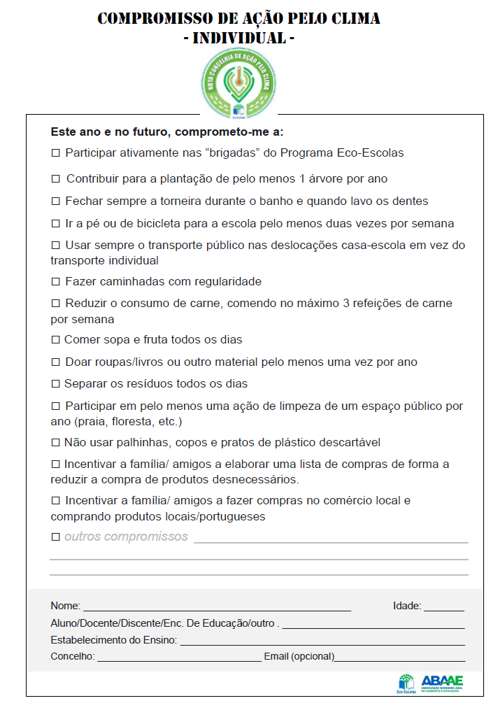 Os compromissos são individuais (ex: motivar a família e amigos para se preocuparem e agirem pelo ambiente; separar os resíduos todos os dias; participar em pelo menos uma ação de limpeza de um espaço público por ano; entre outros) e coletivos de ação pelo clima (ex: promover práticas colaborativas e desenvolver projetos assentes na interdisciplinaridade; Realizar a monitorização e avaliação de ações concretas com impacto positivo em termos de sustentabilidade na escola e/ou comunidade; entre outras).